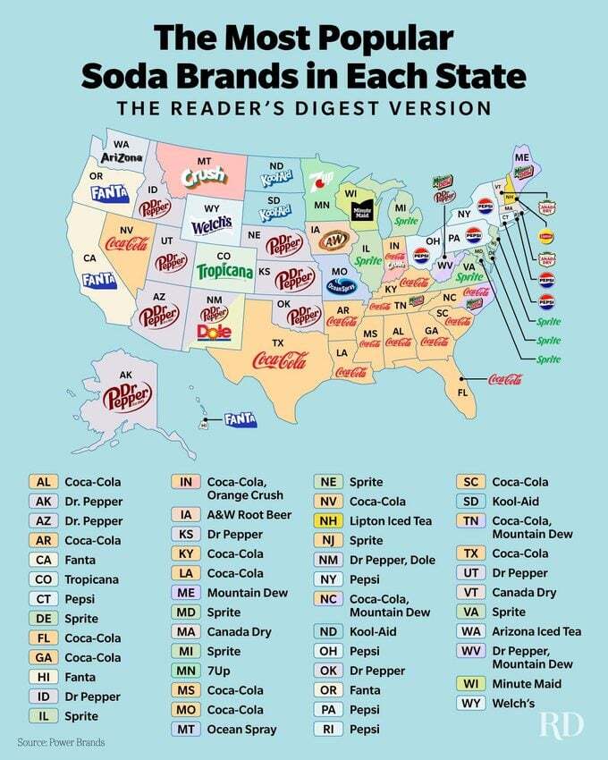 Find out if your favorite soda brand reigns supreme in your state! These are the most popular sodas across the country. (Source: Reader’s Digest)
